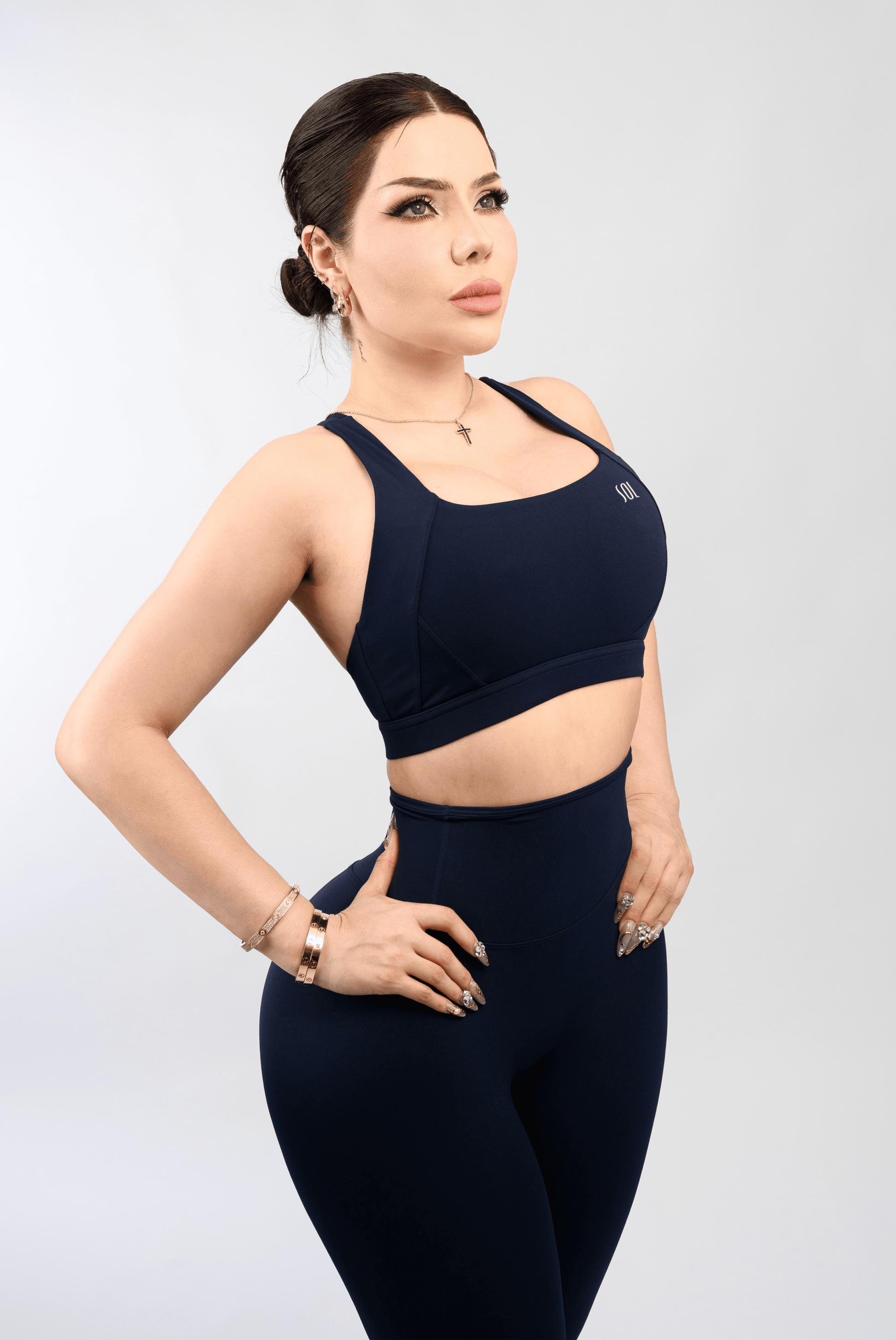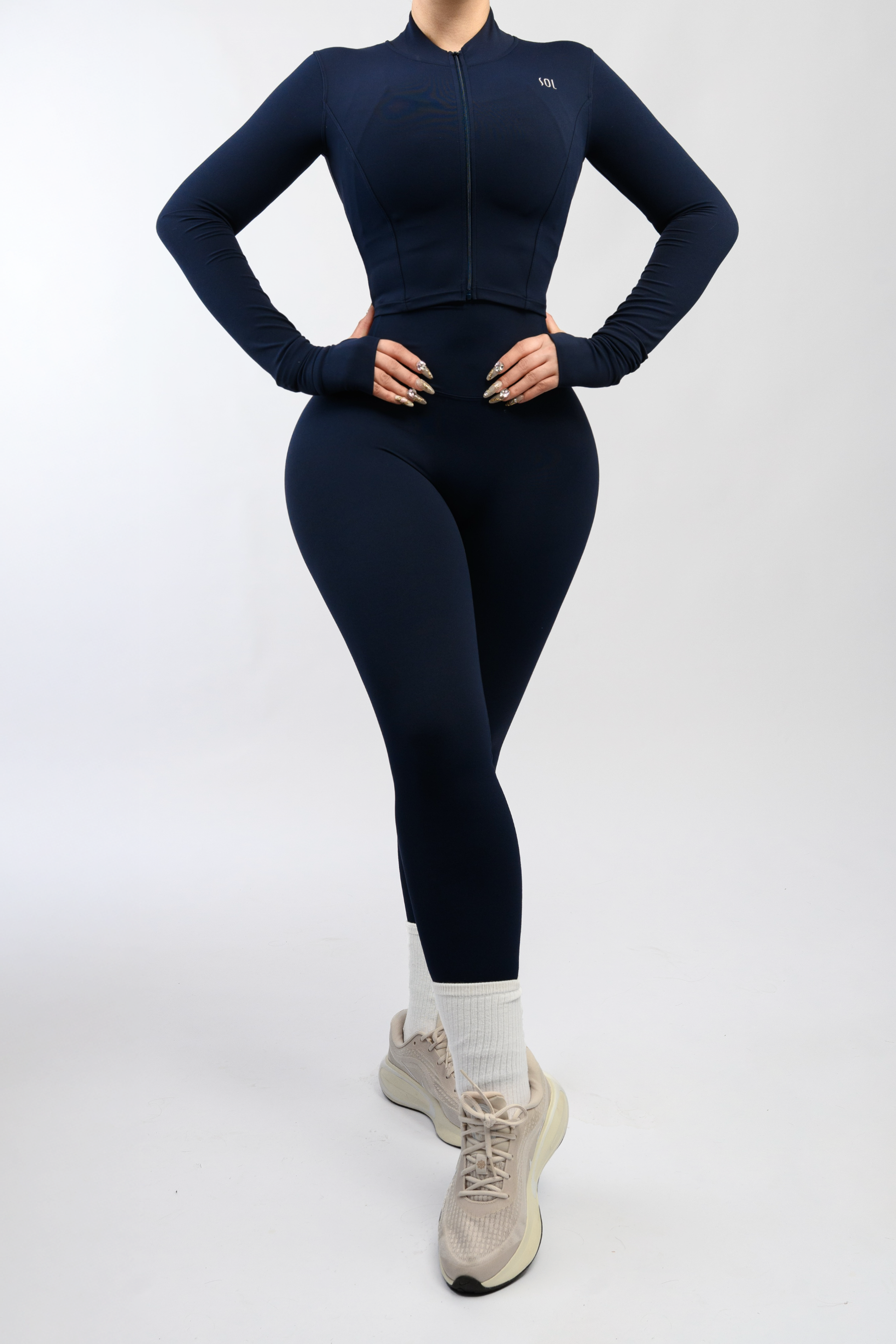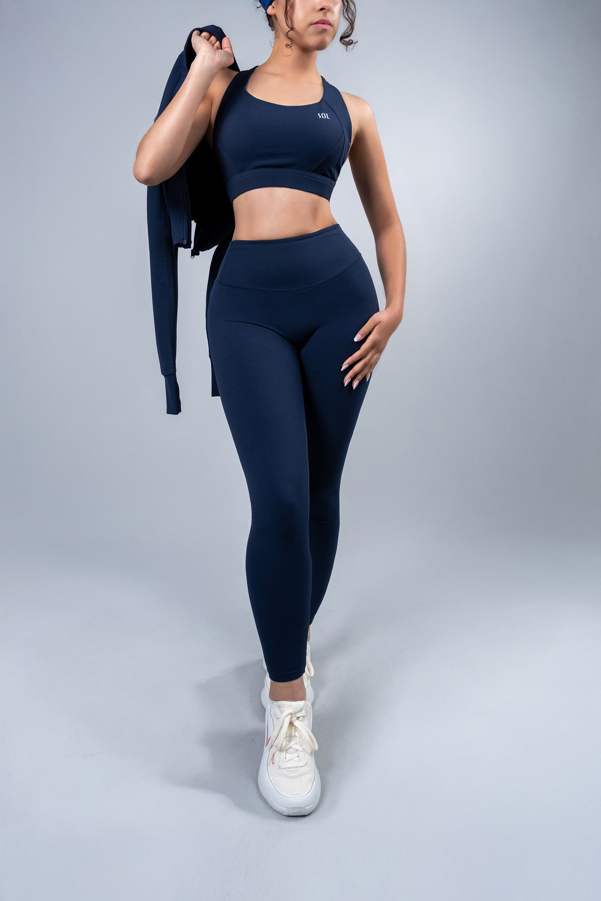 Elegance and high performance merge in this three-piece set, created for women who aim to stand out in both style and performance. Crafted in a sophisticated deep blue tone, this ensemble brings freshness, distinction, and modernity, becoming an essential piece in any exclusive athletic wardrobe.