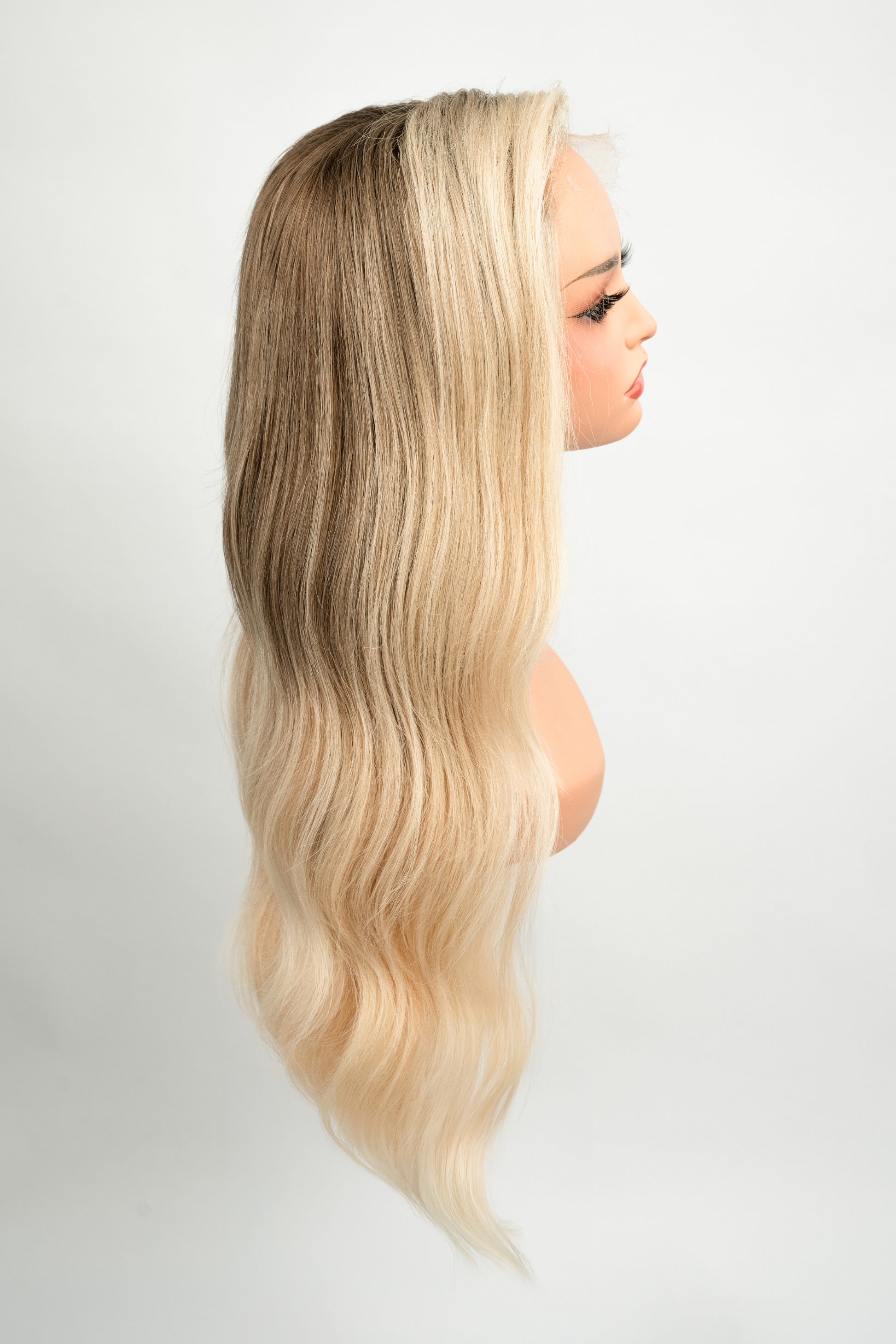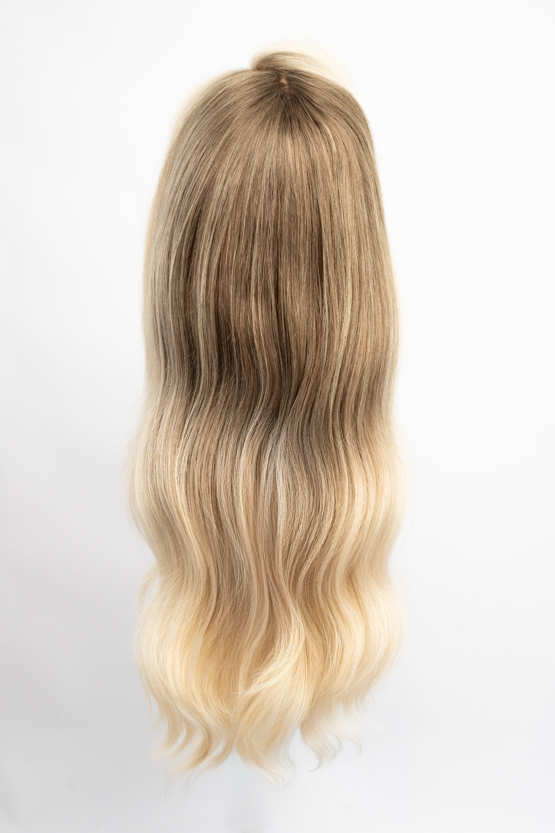 Crafted from 100% natural hair, its silky texture and subtle shine evoke the purest form of beauty, transforming a wig into a true work of aesthetic art. Each strand has been carefully selected and treated with precision to preserve its vitality and organic flow. Its blonde balayage shade, with golden reflections and warm undertones, imparts a sophisticated luminosity that envelops the face in an ethereal glow.